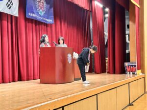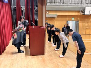 はじめに、テコンドーの大会、AI絵画コンクール、校内マラソン大会で入賞した児童の表彰が行われました。