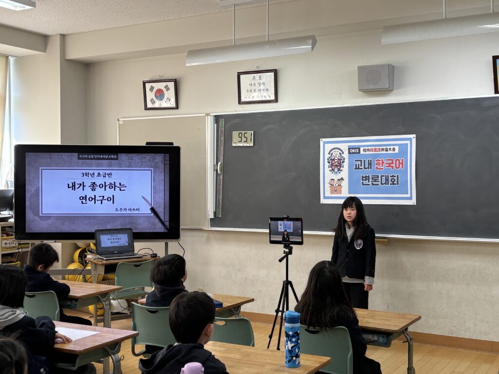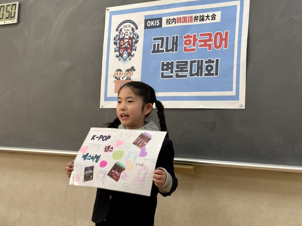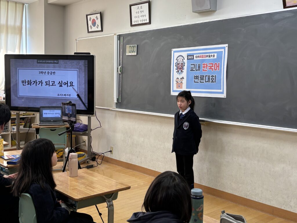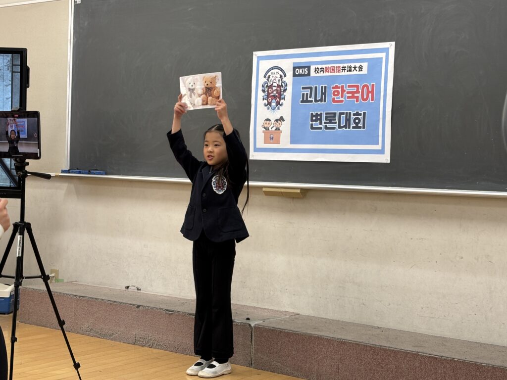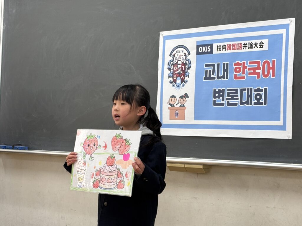 発表に参加した児童たちは、好きなことや得意なこと、将来の夢など、さまざまなテーマについて韓国語で表現しました。少し緊張した様子も見られましたが、勇気を出して最後まで発表を続ける姿に、友だちから大きな拍手と温かい応援が送られました。