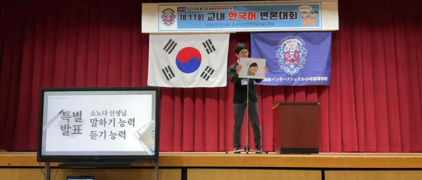 오사카금강인터내셔널소학교의 교내 한국어 변론대회는 학생들이 직접 원고를 작성하고 이를 암기하여, 한국어의 다양한 표현을 활용해 발표하는 행사입니다.